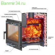 Эту печь можно нагружать большим количеством камней и смело ставить на нее бак с водой. Данные печи изготовлены из конструкционной стали толщиной до 8мм и имеют минимальное количество сварных швов, а в самых уязвимых местах подверженных воздействию высоких температур используются детали, отлитых из чугуна (колосник, зуб отбойник) На всех печах установлены чугунные дверцы в отличии от металлической дверцы чугунные не деформируются и стекла на них не трескаются.