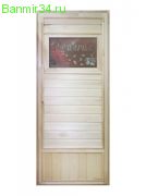 Дверь включает в себя дверную коробку и дверное полотно с стеклянной вставкой с сюжетом.
