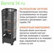 У электрокаменок «GeoS» максимально развитый объем для закладывания камней, поэтому для распределения нагрузки в их конструкции предусмотрены разгрузочные платформы устанавливаемые на несущие опоры. Платформы, в свою очередь, имеют специально оборудованные отверстия для точного позиционирования ТЭН. Это исключает возможность их соприкосновение при эксплуатации, чем продлевает эксплуатационный ресурс.