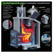 GFS-ЗК 45 - печь с усиленной каменкой большей массы, с единым углублением внутрь топки для дополнительной укладки чугунного заряда. Теплосъемные шипы, со стороны горения пламени, в разы увеличивают площадь соприкосновения огня с каменкой и ускоряют передачу тепла, а также способствуют лучшему дожигу смешивая потоки пламени и воздуха поступаемого из воздушника. Эти усовершенствования значительно повышают мощность парообразования печи и выдают большее количество пара при непрерывной подаче воды. Каменка печей GFS-ЗК является незаливаемой.