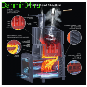 Печи линейки Гром имеют в комплекте чугунный короб для установки на каменку и чугунную стартовую трубу длиной 500 мм. Увеличенная масса, толщина боковых стенок 14 мм повышают надежность и теплоаккумулирующую способность, а для быстрого нагрева парной боковые стенки оборудованы конвекционными ребрами не только снаружи, но и на внутренней поверхности.