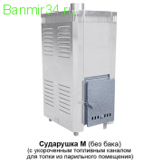 Каменка в двух вариантах – горячекатаная или нержавеющая сталь AISI 439. Модульность элементов печи позволяет собирать её как влево, так и в правостороннем исполнении по выбросу пара. «Сударушка М» удобна тем, что её топка осуществляется из смежного помещения с использованием топочного тоннеля, оборудованного дверкой с панорамным стеклом, позволяющим любоваться пламенем и контролировать процесс горения. Рассекатель пламени, усиливающий дно каменки, значительно продлевает срок службы печи.