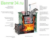 Ключевым элементом печи для бани Эверест INOX 25 (205) под обкладку (AISI 430) является закрытая каменка, размещённая над топочным пространством. Толстые стенки каменки выполняют функцию зуба-отбойника. Пламя и нагретые газы обтекают каменку с пяти сторон, позволяя быстро нагревать закладываемые вовнутрь камни до температуры 550-600 градусов. Вода из верхней ёмкости по трубкам поступает в нижнюю часть каменки и через точечные отверстия равномерно попадает на камни. Система позволяет получать мелкодисперсный пар без чрезмерного остывания камней. Для выхода пара в верхней части каменки оборудована дверка. Система регулирования воздушного потока чугунной дверки помогает чётко дозировать количество пара, выходящего из каменки.