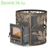 Чугунная банная печь Эверест 24 в кованной сетке.